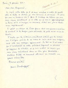 L.A.S. «Jean Dubuffet», Paris 8 janvier 1958, au photographe Raymond BRÉTEL; 1 page in-4.