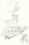 Les dessins au verso, au stylo noir, probablement des idées de tableaux, représentent un rocher, un cercueil avec une lyre, un tronc d'arbre d'où pousse une rangée d'arbres, et un personnage barbu en buste, avec pipe et chapeau.