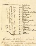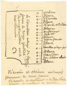 Dessin à la plume de sa palette, avec identification des couleurs y déposées: «chrôme», «Blanc», «Véronèse», «Blanc», «Véronèse et Outremer», «Blanc», «Outremer», «Cobalt», «Blanc», «laque foncée», «Blanc», «Vermillon et laque foncée», «Blanc», «Vermillon», «Jau. chrôme clair», «Blanc». Suivent quelques indications: «Véronèse et chrôme mélangés forment le vert jaune. Véronèse et outremer - le Bleu vert. Laque et outremer le violet»... Et sur la palette même: «Le Vermillon mélangé de laque foncé forme le rouge spectral.