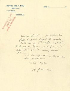 L.A.S. «Rodin», [Paris 19 décembre 1888], à Gustave GEFFROY; carte oblong in-12, adresse au verso (Carte-Télégramme).