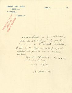 [Jean LIMET (1855-1941), ami de jeunesse de Rodin, devint son collaborateur: Rodin lui confiait la patine de ses bronzes, et le chargeait de photographies son travail.] 31 octobre 1902, Rodin voudrait savoir quand Limet rentre à Paris «pour que nous ne nous trouvions pas débordés par quelques pièces»; il lui remettra «quelque somme». 4 janvier 1913, il voudrait «savoir si ma grande figure est prête»... Sens 18 février 1914. Il lui demande de faire «les photos d'après les marbres de la rue de l'Université et plâtres. La rue de Varenne on les fera, quand je reviendrai peut-être avant, un mois et demi. Il y a des difficultés avec les marbres mais ils ont bons»... Cap