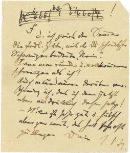Brahms commence par trois mesures de musique extraites de la scène 3 de l'acte I de Die Zauberflöte (la Flûte enchantée), correspondant aux paroles deTamino «So ist denn alles Heuchelei» (Tout cela n'est qu'hypocrisie), puis il écrit: «und ich pries den Sommer die fr[eun] dl[iche] Güte, mit der Du schriebst: Schweigen bedeute “Nein”. Kann man runder und vollkommener schweigen als ich ? Auch m. Bedauern darüber verschwieg ich, das ich denn jetzt aber ausdrücklich daher setze ! - Wien ist sehr gut und und hübsch aber gar weit, das hat sehr oft zu klagen»...