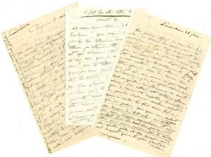 10 L.A. (dont 2 signées «Marie»), février 1834 et juin 1836, à Alfred de VIGNY; 44 pages in-8, 3 adresses (la 1ère lettre incomplète du début).
