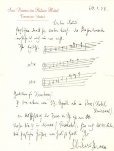 L.A.S. «Richard Strauss» avec MUSIQUE, Taormina 20 janvier 1938, à Eugen PAPST à Cologne; 1 page petit in-4 à en-tête du San Domenico