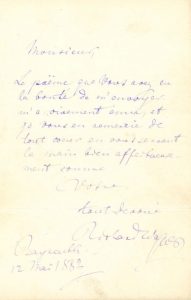 «Le poëme que vous avez eu la bonté de m'envoyer m'a vivement ému, et je vous en remercie de tout coeur en vous serrant la main bien affectueusement»...