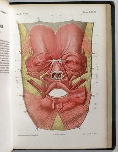 explicatifs en vis-à-vis (qqs bords lég. brunis, qqs taches ou pet. rouss., 1 pl. brunie, pet. mouill. marg. au début du vol. Iii). Rel. de l'époque : demi-chagrin vert foncé, plats de percaline chagrinée verte, dos fleuronnés dorés à nerfs, tr. jaspées de brun (mors sup. des vol. Iet Iii part. fendus, frottées sur les extrémités, coupes et coins émoussés). Illustré de 254 planches rehaussées, qqs-unes dépliantes, d'après les dessins d'Émile Beau. Contient : vol. I : ostéologie, syndesmologie, myologie; vol. II : coeur, artères, veines, vaisseaux lymphatiques et aponévroses; vol. III : splanchnologie (réunion des parties 3 -appareil de la digestion, appareil surrénal, rein- et 4 -appareil génito-urinaire, organes de la respiration-). Ouvrage, dont la publication commenda en 1844, et dont le but était de le rendre pratique et facilement consultable pour les étudiants et médecins praticiens. # Wellcome II-197; pas dans Garrisson & Morton ni Bibl. Wall.