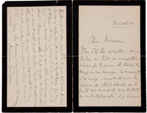 [La lettre se rapporte aux épreuves de la dernière partie de sa traduction des Trésors des Rois de John RUSKIN publiée le 15 mai 1905 dans la revue Les Arts de la Vie dirigée par Gabriel Mourey.]