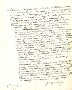 Elle le remercie de son «aimable envoi et de ce bon souvenir que vous avez gardé de moi, tout en voyageant à travers le monde. J'espère que vous viendrez bientôt fumer ce calumet avec nous». Elle lui envoie une page de son prochain article dans la Revue indépendante: «Cela ne rime à rien, et comme je ne fais jamais que de longues et lourdes tartines, je suis fort embarassée de donner des autographes qui ayent un sens.