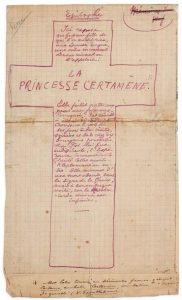 MANUSCRIT autographe, Épitaphe, [1886]; 1 page in-8 sur papier quadrillé, à l'encre rouge dans une grande croix dessinée (fente réparée).