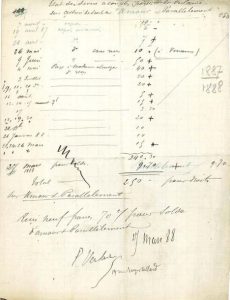 «Compte Paul Verlaine», des ventes de ses oeuvres, des paiements faits à Verlaine et des sommes dues. La réimpression des Fêtes galantes et de Romances sans paroles rapporte 125 francs par titre («compte soldé»). Les Poètes maudits, «2e série & 1 & 2e séries réunies» valent 250 francs, versés en 8 fois, entre le 15 novembre 1886 et le 1er avril 1887, par des sommes allant de 5 francs à 70. «Reste à traiter pour Amour,