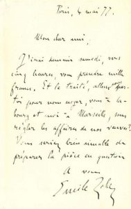 L.A.S. «Émile Zola», Paris 4 mai 1877, [à l'éditeur Georges CHARPENTIER]; 1 page in-8.