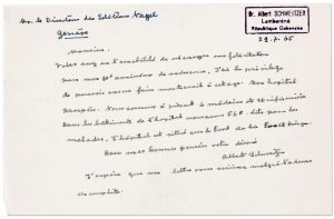 «Vous avez eu l'amabilité de m'envoyer vos félicitations pour mon 90e anniversaire de naissance. J'ai le privilège de pouvoir encore faire mon travail à cet âge. Mon hôpital prospère. Nous sommes à présent 6 médecins et 16 infirmières. Dans les bâtiments de l'hôpital nous avons 560 lits pour les malades. L'hôpital est situé sur le bord de la Forêt Vierge»...