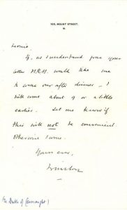 Si, comme il croit comprendre d'après la lettre de Leonie, S.A.R. [Arthur, duc de CONNAUGHT, fils de la Reine Victoria, longtemps amant de Lady Leslie] souhaite qu'il vienne après dîner, Winston viendra vers 21 h, ou un peu plus tôt. Qu'elle lui fasse savoir si cela ne convient pas...