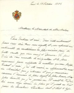 L.A.S. «Isabelle de Bourbon», Paris 18 octobre 1893, à Élisabeth de La Croix de Castries, duchesse de Magenta, maréchale de MAC-MAHON; 1 page et demie in-4 à ses armes.