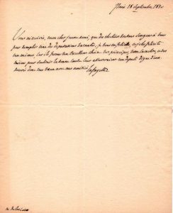 18 septembre 1830. «Vous m'écrivés, mon cher jeune ami, que des électeurs bretons songent à vous pour remplir une des députations vacantes: je vous en félicite, et je les félicite eux-mêmes, car ils feront un excellent choix. Vos principes, votre caractère, et vos moïens pour soutenir la bonne cause leur assureraient un député digne d'eux. Recevés donc mes voeux avec mes amitiés»... 21 août 1832. «J'aurais été fort heureux, mon cher collègue, d'assister à votre scientifique séance dont l'objet a depuis longtems excité mon très vif intérêt, mais je suis obligé de retourner à la