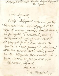 L.A.S. «Gius. Mazzini», 8 avril, à «Moi Signore»; 1 page petit in-12 (trace de collage au dos); en italien.