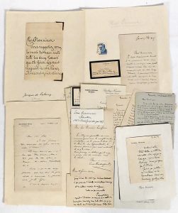 des manuscrits et Conservateur de la Bibliothèque Royale de Belgique.- 1 l.a.s. in-8°, 1903, à l’en-tête "Bibliothèque Royale de Belgique" : furieux contre l’arrivée de manuscrits "von Syben" (?) pour lesquels on demande 3.000 francs et qui ne sont qu’une copie récente et non pas le manuscrit du pensionnaire J.B. Syben promis.— MEUNIER, Constantin (1831- 1905).- billet aut. signé, [1903] : s’excuse de ne pouvoir venir à Anvers à cause de sa femme souffrante.— PIRENNE, Henri (1862-1935).- 1 l.a.s. in-8° et 1 carte de visite, 1909 et [1925] : remerciements et s’excuse de ne pouvoir donner un travail à critiquer au destinataire par manque de temps.— Lettres à LIEBRECHT, Henri (1884-1955), écrivain et membre de l’Académie royale de langue et littérature frangaises de Belgique, 13 l.a.s. in-8°, par Émile Magne, Gustave Lanson, Pierre Mille (?), Jean Richepin, Georges Mongrédien, Louis Barthou, Henri de Régnier, Paul Morand et J.-H. Rosny, [1905]-1938 : principalement de remerciements, demande de préface pour un ouvrage, autorisation de reproduction dans le "Soir illustre" et demandes d’informations dans le cadre d’une recherche sur le théâtre en France.— ZOPPI, Giuseppe (1896-1952), professeur suisse de littérature à l’École Polytechnique.- 1 l.a.s. pet. in-12°, 1949 : conseille au destinataire de s’adresser au professeur Carlo Pellegrini pour sa bibliographie sur la comtesse d’Albany.— LALAING, Jacques de (1858-1917), peintre et sculpteur.- 1 l.a.s. in-8°, s.d. : sur le souhait de Ch. Giron d’exposer une toile à Anvers ("Fête de lutteurs dans l’Oberland". Le reste de Paul Champagne (2 l.a.s.), Louis Hardenpoint, René Huyghe et doc. imprimé "Adresse au peuple belge" par le général du Mourier dans lequel il exhorte les Belges à la liberté et à se libérer de la domination du clergé.