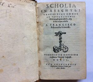 ESCHYLE. Scholia in Aeschyli Tragoediae omnes ... collecta atque ... redacta a Francisco Robortello..(Graece). Venise, Vincent Valgris, 1552. (A la suite : Aeschyli Tragoediae sex (Graece). Paris, Turnèbe, 1552. (A la suite :) Aeschyli tragoediae... e graeco in latinum par J. Sanravium. Bâle Oporin, vers 1550. (Incomplet) 3 ouvrages en 1 volume in-8, veau blond du XVIIIème siècle. (Médiocres restaurations au dos et à un mors. Une coiffe arrachée.) a) Edition de Valgris : première édition des Scholies (Schweiger, page 7. Schoell, II, 26 : "Volume rare et recherché") b) Edition de Turnèbe : 2ème édition des pièces d'Eschyle, après Alde en 1518, s'appuyant sur un nouveau manuscrit pour les 3 premières pièces. Le feuillet M5 (pages 187-188) manque. (Schweiger, page 7. Schoell, II, 26)
