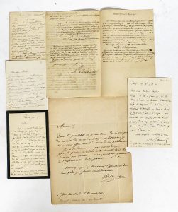 visite en allemand, 1851-1862 : 2 aux frères Van Maldeghem : a) 18-01- 1851 : se désole du fait qu'ils ne soient pas venus lui rendre visite à Homberg, se réjouit qu'ils aient "établi un négoce de musique à Bruxelles", envoi d'un num. de l'"Urania" sur la musique religieuse en Belgique dans lequel il les mentionne, les remercie pour les num. de la revue "Cecilia" (dont Robert fut rédacteur en chef), précise qu'il accepterait volontiers un poste à Bruxelles et demande si leur frère Eugène a fini sa peinture "le sermon de notre St Sauveur à la montagne"; b) 27-02-1858, à Robert : attend la critique faite par lui de "Cecilia", demande de l'aide pour Mr Arnold (docteur en philosophie et marchand de musique à Elberfeld) qui cherche des chansons allemandes et flamandes, passera à Bruxelles à son retour de Paris.— VIARDOT, Pauline (1821-1910) cantatrice frangaise.- 2 l.a.s. in- 16°, s.d : dont une, au chiffre de son nom de jeune fille (Garcia), à son futur mari Louis Viardot (?) à propos de la signature du contrat (de mariage ?) et s'excuse de n'avoir pas pu le recevoir.— BÉRIOT, Charles-Auguste de (1802-1870), violoniste et compositeur belge.- 1 l.a.s. in-4°, 1844 : s'excuse auprès de J.-B. Maddou de ne "pouvoir s'occuper des intérêts du Cercle artistique et littéraire".— GOUnOd, Charles (1818-1893).- 1 l.a.s. in-12° à "Mon cher monsieur Barbier" [i.e. Jules Barbier ?], 1[8]79 : Décline une invitation du librettiste J. Barbier (1825-1901) (?), auteur de la plupart de ses livrets ("Faust", "La Reine de Saba", "Polyceute"...) : "Hélas! C'est à peine si j'ai le temps d'écrire - Comment trouverais-je celui de voyager ? - J'ai un hiver écrasant de travail - puis en mars il faut que j'aille à Cologne, et à Moulins [...] - Gouzien [i.e. Armand (18391892) ?] sort de chez moi à l'instant : il venait de votre part".— FAUCHEY, Paul (1858-1936), compositeur et chef d'orchestre frangais.- 12 l.a.s. in-12° ou in-8° et 2 cartes pneumatiques timbrées, 1891-1906 : correspondance amicale à l'écrivain et journaliste Montorgueil : félicitations pour un article, le remercie de parler de son roman "Le droit de l'amant" et de faire son portrait dans "L'Éclair", retrace son parcours...— TIERSOT, Julien (1857-1936), musicologue frangais.- 1 l.a.s. in-12°, 1903 : à propos de ses "Notes d'ethnographie musicale".— CASALS, Pablo (1876-1973), 1 lettre dact. signée in-8° en anglais, 1957 : explique qu'avec qqs amis américains il a fondé un Comité d'aide aux réfugiés espagnols suite à la guerre civile et espère que son correspondant, Mr Cyfer, apportera de l'aide aux réfugiés en France.— 3 chansons grivoises anonymes, 3 pp. in-f°, 1789 (?) (pet. us) : "La bergère Hélène", "Éloge du confrère Bonaventure. Air de Joconde", "Eh qu'est-ce que ga me fait à moi".