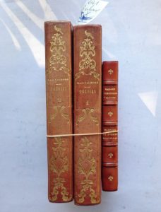 LITTERATURE ROMANTIQUE. - Poésies de Madame Desbordes Valmore. Paris, Bouland, 1830. 2 volumes in-8, 1/2 veau rouge du temps, dos sans nerf orné de fers rocaille. (Dos légèrement passé). Première édition complète, renfermant plus de 50 poèmes en édition originale, illustrée de 4 figures hors-texte sur Chine appliqué. Conformément à la remarque de Clouzot (page 46), et comme dans la quasi totalité des exemplaires, 2 cahiers (I, 16 et II, 32) sont uniformément roussis. - Elégies et poésies nouvelles par Mme Desbordes Valmore. Paris, Ladvocat, 1825. In-18, 1/2 veau à coins. Reliure moderne. (Brûlure dans la marge inférieure des pages 17 à 22 ; quelques rousseurs et défauts divers.) Edition originale pour toutes les pièces du recueil. (Clouzot, page 46). On joint: Théophile Gautier : - Ménagerie intime. Paris, Lemerre, 1869. In-12, 1/2 maroquin lie de vin ; initiales J.P. en queue. Reliure du temps. Bon exemplaire de l'édition originale. - Poésies de Théophile Gautier qui ne figureront pas dans ses oeuvres, précédées d'une autobiographie, ornée d'un portrait singulier. France, Imprimerie particulière. 1873. In-8, broché, non rogné. Couvertures gaufrées vertes et muettes conservées. (Déchirure sans manque au dos, qui est décollé ; couvertures très insolées). Edition originale sur papier de Hollande, tirée seulement à 162 exemplaires (150 sur Hollande, et 12 sur Chine). L'ouvrage, imprimé en fait par Poulet-Malassis, est illustré d'un portrait-charge de l'auteur sur Chine. (Vicaire, III, 939) En tout 5 volumes.