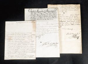 nom et titres de Charles de Lorraine, sign. aut. et signature de J.C. de Beelen par Ordonnance de S.A.S. Joint : (2). HARRACH-ROHRAU, comte Frédéric d' (1696-1749), conseiller de la reine de Hongrie, gouverneur intérim des Pays-Bas.-Lettre aut. s. Bruxelles, 4 juillet 1742, qqs lignes sur un bifolio in-f°, à propos de la requête (éconduite) de Jean Léonard (i.e. l'imprimeur ?).— (3). CROY, Ferdinand-Joseph de (1644-1694).- Lettre signée à propos de la vacation de la charge de bailli de ses terres de Biévène, Hornu, etc. donnée à Ignace Frangois de Masener, seigneur de la Haye. Brux., 7 juillet 1690, 17 lignes en frangais, sur peau de vélin, sceau rouge, pliures.— (4). CROY, prince de.- Lettre aut. s. à Mr de Gheuse, "Premier eschevin à Ypres", Petit Quesnoy près de Lille, 29 octobre 1749, 1 p. in-8° sur papier vergé, sceau rouge, pliures. Il mande quelqu'un pour aller chercher "cent louis d'or de france" à Ypres et deux autres personnes à Bruges.