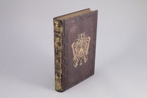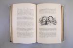 REYBAUD, Louis. Jérôme Paturot à la recherche d'une position sociale. Par Louis Reybaud, auteur des Etudes sur les réformateurs ou socialistes modernes. Edition illustrée parJ.J. Grandville. Paris, Dubochet, Le Chevalier et Cie, 1846. Grand in-8, (4 ff) et 460 pages. Reliure illustrée par Grandville en 1/2 chagrin , larges armoiries fantaisistes sur les plats surmontées d'un bonnet de coton et encadrées d'une paire de chausses, avec la devise "Je n'en fais qu'à ma tête" : dos sans nerf orné d'une échelle sociale (Mme Paturot est sur le barreau inférieur de l'échelle, tandis que Jérôme Paturot accède au sommet). Toutes tranches dorées. Reliure de l'éditeur. (Très légers frottis sur les mors. Rousseurs sur les premiers et les derniers feuillets). Première édition illustrée. "Nombreuses vignettes dans le texte et 32 compositions hors-texte y compris le frontispice gravés sur bois... L'illustration est charmante, c'est une des meilleures productions de Grandville, le livre est bien imprimésur beau papier" (Carteret, III, 516)
