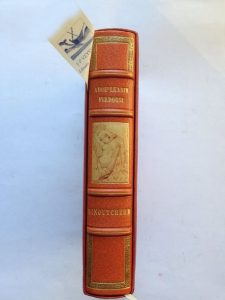 ABOU'LKASIM FIRDOUSI. Histoire de Minoutchehr selon le Livre des Rois. Illustré par Michel Simonidy. Paris, Editions d'Art Piazza. 1919. In-4°, plein maroquin orange, encadrement d'une roulette poussée sur une bande de maroquin bleu-nuit ; large décor central de fers dorés dans lequel s'inscrivent des motifs de fleurs mosaïquées. Dos à quatre nerfs, les compartiments de tête et de queue bordés de trois côtés d'une roulette poussée sur une bande de maroquin olivâtre ; le compartiment central orné d'une illustration en couleurs représentant une femme alanguie. Tête dorée. Large bande de maroquin intérieur, encadrée de deux filets droits se joignant dans les angles par un motif mosaïqué de fleur. Doubles gardes. Etui bordé de maroquin cerise. Couvertures et dos conservés. Reliure du temps signée E. Berthet. (Peut être Etienne Berthet, relieur à Valence, de 1895 environ à 1935). Tirage à 550 exemplaires, celui-ci un des 450 sur papier vélin. Ouvrage illustré de 47 charmantes compositions en couleurs, dont 11 hors-texte. (Monod, Manuel de l'Amateur d'Illustrés Modernes, n°4612)