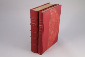 ROY, Jules. Turenne. Sa vie et les institutions militaires de son temps. Paris, Georges Hurtrel, artiste-éditeur. 1884. 2 volumes in-4° . Texte : frontispice en chromolithographie, XXII pages et 520 pages, non rognées ; couvertures conservées. Atlas pour la suite. 1/2 maroquin à coins à gros grains écrasés. Tête dorée. Reliures parfaitement établies vers 1930. Tirage limité à 150 exemplaires numérotés sur vélin à la cuve. Illustrations de Lix, Adrien Marie, Lepère, Charles Goutzwiller. Le volume de suite renferme une trentaine de planches, dont 25 dessins originaux à l'encre de Chine, certains à pleine page, signés Goutzwiller, dessins préparatoires pour les gravures. Charles Goutzwiller (Altkirch 1819-1900), historien de l'art, peintre et dessinateur de talent, fut le premier professeur de Jean-Jacques Henner. Ses dessins sont d'une extrême finesse. Parfait exemplaire.