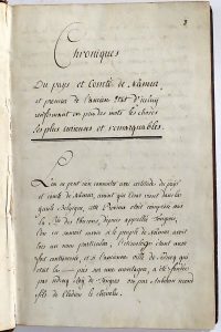 (Belgique, Archivalia) - Ens. 2 copies du même ms. - [Croonendael, Paul de].- "Chroniques du paijs et comté de Namur, et premier de l'ancien État d'iceluij renfermant en peu des mots les choses les plus curieuses et remarquables". 18e s. In-f° :...