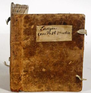 (Belgique, Archivalia) — "Registre des cens payables au jour st Martin d'hyver onze novembre [...]". 1756 [- 1795]. In-12° carré : [+/- 120 ff dont plusieurs vierges]. Rel. de registre de l'époque : plein veau, dos lisse, lacets de fermeture en...