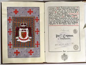vélin, chaque feuillet avec cachet armorié dans le bas, avec ornementation peinte, signatures et cachets divers in fine. Chemise armoriée en peau brune, plat sup. orné d’armoiries centrales et aux angles serties de filets dorés (décor sérigraphié ?), fleuron au plat inf. Armoiries et titre décernés en remerciement pour services rendus "en vue de notre accession au trone des Hellènes" en 1935. Lettre donnée par le "Prince" Eugenio II Lascaris Comnène, duc d’Athènes (mort en 1962), autocrate proclamé, nommé par sa volonté maïtre de l’Ordre Impérial de Constantin le Grand dont il conféra le titre à tout le monde. Il fut aussi le créateur de l’ordre, tout aussi fantaisiste, de Saint Eugène de Trébizonde. Joint : 5 lettres de l’Ordre de saint Lazarre de Jérusalem à Malte (en anglais) + 4 diplomes de chevalerie de cet ordre, 1984, 1985, 1990 et 1992 (grades divers).— 4 lettres de l’Ordre de Saint Jean (identiques).— Diplome de l’Ordre des Hospitaliers de Jérusalem, 2002.— Lettre de l’Ordre de Chevalerie et Milice de Livonie, 1984.— Lettre certifiant la donation du Sanctum Regum (consécration des Rose-Croix), 1979.