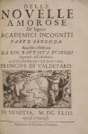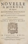 CARMENI Francesco. Novelle amorosa de'Signori Academici incogniti. Venise, héritiers de Sarzina, 1641 ; in-4°, veau brun de l'époque un peu frotté, dos à nerfs orné, petites galeries de vers à un angle.