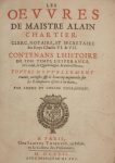 CHARTIER Alain. Les oeuvres de Maistre Alain Chartier, clerc, notaire, et secrétaire des roys Charles VI & VII. Contenant l'histoire de son temps... Paris, Samuel Thiboust, 1617 ; fort vol. in-4°, veau brun ancien, reste de décor " à la Duseuil " sur les plats, dos lisse (reliure en partie rongée par des insectes, intérieur intact).