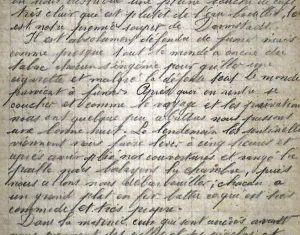en russe. Carnet quadrillé en moleskine noire (lég. usures). Sans rature ni aucun espace libre, le journal relate l'histoire d'un soldat brancardier, origi- naire de Cazouls-les-Béziers dans l'Hérault, contée avec une extraordinaire précision et une multitude de détails. Commencé à Königsbrück le 15 décembre 1914, il se termine de fagon abrupte vers la mi-février 1915, la suite ayant très probablement été consignée dans d'autres cahiers aujourd'hui disparus. Prisonnier des Allemands depuis 4 mois , il prend une décision : afin "de m'occuper et aussi pour garder un souvenir de ma captivité, j'entreprends le récit de ma campagne" en remon- tant au 22 juillet lors des prémisses de la guerre et des tensions européennes. La mobilisa- tion commence le 2 aout et un grand désir de servir la France envahit les hommes et notre diariste. Avec beaucoup d'entrain, il quitte son village de Castelnaudary (Aude) avec ses camarades (brancardiers ?) sous les vivats de la foule, vivats qui continueront tout au long de leur trajet en train jusqu'à Mirecourt. Là, ils continuent à pied, sous la chaleur, jusqu'aux zones de combat : Manonville (qui tombera le 27 aout), Domjevin, Igney, Avricourt, jusqu'à la douane et la frontière avec l'Allemagne (p. 20). "En passant dans la lorraine allemande tous les soldats lèvent leur képi pour dire au revoir à la Patrie, à la France. Hélas beaucoup ne la reverrons plus, mais à ce moment là personne ne songe à cela tout le monde est joyeux et content de rentrer en Allemagne" (p. 22). En traversant les villages allemands, quelques vieux leur sourient ("ils entrevoient l'espoir de redevenir ce qu'ils étaient aupara- vant", p. 23). Près de Sarrebourg, les canons tonnent et ils voient leurs premiers blessés et morts, aident à la logistique médicale, à ramener des blessés du front et partagent des informations avec d'autres compagnies ayant déjà été au feu (p. 28 sq). Les nuits sont terribles avec les cris des agonisants (p. 30 sq). Courage des officiers, batailles, bombar- dements, replis stratégiques... : tout est décrit de fagon très précise, même le moment où, pris entre des feux, l'aide-major de la compagnie, un homme "des moins émotionnés prend un mouchoir blanc d'une main et le drapeau de Genève de l'autre" pour signaler qu'ils transportent des blessés. Malgré cela, ils sont faits prisonniers (p. 35 sq : épisode amusant de la confiscation des instruments de musique, choix de ce qu'ils emportent avec eux, comparaison d'équipement avec les soldats allemands). Ils font route à pied, témoins des spectacles désolants de la guerre (soldats tués, entassés pêle-mêle, fusils brisés...), mais les officiers et soldats sont traités correctement bien que de fagon rudimentaire et presque sans manger. Les prisonniers portent leurs blessés, sont rejoints par des civils lorrains accusés d'avoir hébergé des blessés frangais. Ceux qui succombent sont enterrés le long des routes. A Falkenberg (Faulquemont ?), près de Morhange, ils montent dans un train (p. 47 sq) qui les conduira à Darmstad, près de Frankfurt, où ils restent quelques jours dans un camp avec d'autres prisonniers (p. 53 sq). Ils reprennent ensuite le train jusqu'à Dresden et arrivent à pied au camp de Königsbrück le 27 aout 1914 (p. 59). Com- mence la description fort minutieuse de la vie de prisonnier à laquelle le reste du carnet est consacré : lieux, stall, literie (à 3 par lit sur une couche de paille et une couverture), repas et collations diverses, travaux (à l'infirmerie pour notre brancardier -parfois à l'hopital de Königsbrück-, quelques travaux de cantonnier ou de propreté), tracas divers, rapports avec les surveillants allemands (assez tranquilles dans l'ensemble), punitions (rares), hygiène (poux), lessive, gymnastique obligatoire, événements divers dont l'arrivée de 3.000 Russes en septembre 1914 (p. 79), construction de baraquements, commentaires sur les nou- velles du front via la presse allemande ou les lettres des familles, description de chasseurs saxons, achats de denrées au marché noir, obsession des fumeurs pour assouvir leur dépendance, correspondance -surveillée- avec la famille, ennui des longues journées et passe-temps divers (construction de jeux, petites sculptures, tatouages, petits concerts, cigarettes... p. 101 sq.), rencontre avec un ami au camp (p. 103), rudesse de l'hiver, démé- nagement dans une baraque dans une autre partie du camp (nouvelle description des lieux et usages), cohabitation avec des Russes entraïnant des amitiés et de nouvelles occupa- tions (enseignement des langues pour communiquer), travaux de fabrication de béton avec du "mâche-fer", esquive du travail suivie de punition, durs travaux dans le froid de l'hiver, fêtes de Noël et Nouvel-An 1914-1915 (p. 123 sq.), désinfection des baraques et prison- niers, réception des mandats d'argent envoyés par les proches, rapports avec les gardes allemands et avec les prisonniers russes (très religieux), etc.