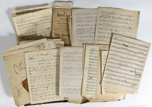 (Musique) — Poschen, Guillaume Joseph.- Archives. Plusieurs fardes de partitions mss ou divers documents. Dans une grande caisse en carton. Archives musicales de Wilhelm (Guillaume) Poschen, né à Stolberg, Allemagne, en 1858, installé à...