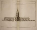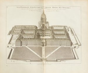 PÉRAU Gabriel-Louis. Description historique de l'hôtel royal des Invalides. Paris, Guillaume Desprez, 1756 ; fort vol. in-folio reliure de l'époque veau marbré, filets et grosse fleur de lys aux angles dorés sur les plats, dos à nerfs fleurdelisé, dentelle intérieure et tranches dorées, un mors fendu, usure aux coiffes et à deux angles.