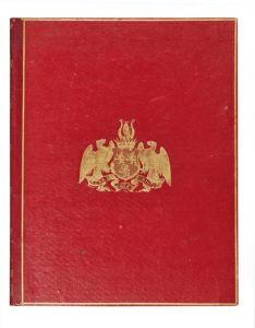 Avec un grand tableau généalogique aquarellé plusieurs fois replié (déchirure sans manque). Charles-Maurice duc de Talleyrand, prince de Bénévent (+1838) apparaît à la fin. LA RELIURE EST À SES ARMES avec la devise " Ré que Diou ".