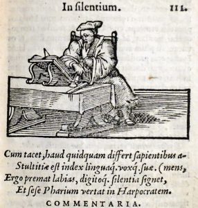 Alciato, Andrea.- Emblematum libri li [...]. Antverpiae, ex officina Christophori Plantini (excudebat Christophorus Plantinus), 1565. In-16° : [8]-229-[2] pp. (foxing and small dampstains in the end, small marginal tear in p. 221, handwritten notes...
