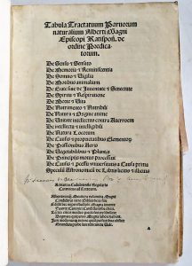 on title-page, foxing, marginal dampstains, stains on lvs 36-42, margins partly repaired, rare marginales notes, wormholes in the end -some with very small lacks of text and one repaired-). Contemporary binding : parchment, flat spine with leather label, red sprinkled edges (small wormholes, handwritten classification on upper board, stains, label stuck on the upper pastedown, slightly trimmed). First edition (?) of this very rare early postincunabulum by the Dominican Albertus Magnus (1206-1280), bishop of Regensburg and teacher of Thomas Aquinas, canonised in 1931. Work given by the Italian doctor and philosopher Marco Antonio Zimara (1460-1523) containing treatises on : memory, breathing, youth and old age, nature, plants and vegetals, astronomy, "licit and illicit" books... Text on two columns in gothic typsetting decorated with initials letters (some dotted and/or larges) and the printer's mark in the colophon. In 1517- 1519, was published in Venice, also by the heirs of Ottaviano Scotto, another work of Albertus Magnus given by Zimara, the "Naturalia and supranaturalia". # USTC 808374; # Adams A-529 ("Naturalia ac supranaturalia"); # STC Italian 12 (id.) # not in Machiels, Soltész, Bibl. Wall., Garrisson & Morton, Wellcome, A catalogue of Sixteenth Century printed books in the National Library of Medicine. fl Édition originale de ce très rare post-incunable de l'ouvrage de l'évêque de Ratisbonne, Albert le Grand, donné par Zimara. Traite de la mémoire, de la respiration, de la jeunesse et vieillesse, d'astronomie, des livres "licites et illicites"... Texte en caractères gothiques sur 2 col. Plein parchemin de l'époque (qqs pp. brunies, restaurations marg., galeries de vers à la fin -parfois avec très pet. manques de texte-).