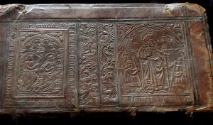 bl.]-89/150-153/227-[1 ] lvs (some marginal stains, some lvs slightly yellowed, small wormholes in the beginning, rare marginal tears, some foxing otherwise fresh copy). Contemporary Flemish binding : calf, boards with 2 blind panel-stamps figuring the Annunciation and Saint James with text in gothic typesetting and separeted by decorated frames, all encircled by blind filets, ribbed spine with blind fillets (upper joint partly split, ties and turn ins lacking, calf partly unstuck on the spine, slightly rubbed, some small stains, three corners dulled, the upper one strongly with lack of leather, re-used vellum with handwritten text on the pastedowns). Second edition (1, ed. : 1502 or 1515 ?), published in the Aldine press, of this work containing the astronomical tables of Ptolemy (c. 90- c. 168) and 5 work extracts of Ovid : "Fastorum", "Tristium", "De Ponto", "In Ibin" and "Ad Liviam". All given by the Italian philologue Nicolò Leonico Tomeo (14561531). With the Aldine marks on title-page and on the back of last leaf. Nice panel-stamped binding with two religious scenes (71 x 52 mm) not listed in Fogelmark, "Expositition de reliures. Du XII, siècle à ia fin du xvr of the Belgian Royal Library and in "Boekbanden uit vijf eeuwen". The first of the Annunciation figures Mary on a prie-Dieu with a star above and on her left Gabriel. The Saint is handing a banner (without inscription) and has the Holy Spirit above him. The scene takes place inside, under diagonal ribs. This panel is surrounded by the text : "Ave gracia plena d[omin]us tecu[m] ecce a[n]cilla d[o]m[in]i fiat michi secundum verbum tuum" with artichokes flowers in the angles. The second panel figures Saint James with 4 prayers (2 on each side) under a vault with the key "Sancte Jacobeo" (?) below. These two panels are separeted by two decorated frames with oak leaves, dragons opposing chimaera, a character or an ape (?) and a man riding a dragon (?). # Adams P-2238; # Renouard 78; # SCT Italian 542 (ed. 1515) and 479 (Works of Ovid) # Soltész O-270 (1567); # not in USTC nor in Machiels. fl Seconde édition des tables astronomiques de Ptolémée et de 5 extraits d’oeuvres d’Ovide ("Les Fastes", "Les Tristes", "Les Pontiques", "L’ibis", "Consolation à Livie Augusta"), donnés par le philologue N. Leonico Tomeo. Plein veau de l’ép. avec des plaques figurant l’Annonciation et Saint Jacques (qqs rouss., qqs taches et mouill. marg., lacets et coiffes manquants, cuir au dos part. décollé).