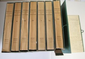 " Mémoires du Prince de Talleyrand ". Paris, éditions Henri Javal. 1953. Ensemble de 7 volumes in-4 en feuilles sous chemise titrée au premier plat sous emboîtage d'édition, complet du fac similé sous portefeuille cartonné d'édition (Grand livre vert. 12 feuillets recto en cahier). Riche iconographie en noir et blanc. Bandeaux et culs de lampe. Exemplaire numéroté. Un étui en partie éclaté, dos classiquement jaunis et parfois légèrement accidentés. Bon exemplaire.