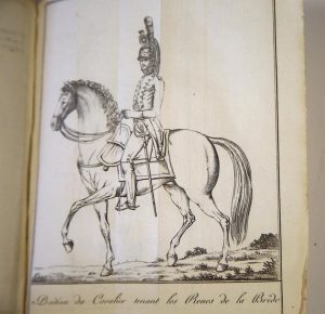 " Ordonnance provisoire sur l'exercice et les manoeuvres de la cavalerie rédigée par ordure du ministre de la guerre du 1er Vendémiaire An XIII ". Chez Magimel, an XIII (1804). In-12 relié demi basane d'époque, dos carré, pièce de titre et de tomaison. Page de titre, 10 pages de table des planches. 126 planches dont 9 bis. Nombreuses planches dépliantes. Coiffe défraichie et petit manque de cuir en pied. Exemplaire solidement relié.