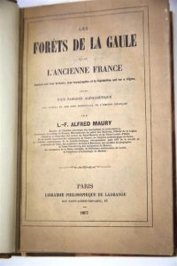 Maury (Alfred. L.F) " Les forêts de la Gaule et de l'ancienne France. Aperçu de leur histoire, leur topographie et la législation qui les a régies. Suivi d'un tableau alphabétique des forêts et des bois principaux de l'Empire français ". Paris, librairie philosophique de Ladrange, 1867, in-8 relié demi basane à nerfs (reliure postérieure), couverture conservées. Légères rousseurs sans gravité, reliure légèrement tachée. Bon exemplaire.