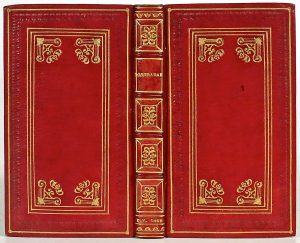 titre gravé et portrait]-158 pp. (pet. brunissure aux sff.). Reliure du xixe s. : plein maroquin rouge, plats sertis de filets et fleurons d'angles romantiques dorés et de roulette à froid, dos à nerfs et caissons à fleurons romantiques dorés, roulette ornée et filets dorés sur les coupes et remplis, tranches dorées. Jolie édition jointe à la collection des Elzevier et basée sur les éditions d'Avignon (1556), Lyon (1558) et probablement aussi de Leiden (1650). Illustrée d'un titre gravé représentant la décollation de Charles I. d’Angleterre et l’incendie de Londres ainsi que d’un portrait en pied du célèbre astrologue provengal (Saint-Rémy 1503-1566 Salon). L'originale parut à Lyon en 1555. Le portrait est présenté avec la légende ("Vera loquo [...]") (état non signalé par les bibliographies). # Willems n° 1797; # Bibl. esoterica n° 3275; # Caillet n° 8081; # Brunet IV-105.