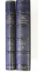 Callon (J) " Cours professés à l'école des Mines de Paris ". Paris, Dunod éditeur, 1874. Deux volumes in-8 et deux volumes in-4 d'atlas reliés demi basane. 3 parties de texte en deux volumes et 3 parties d'atlas en un volume. 118 planches souvent dépliantes finement gravées. Bonne condition.