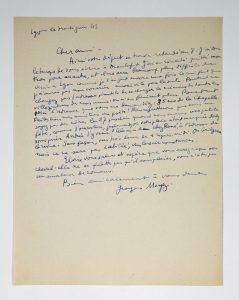 Lettre codée écrite sous l'Occupation par Louis Aragon qui signe Georges Meyz. Elsa Triolet est nommée Elvire, et il donne l'adresse d'Eluard sans le nommer. «[...] Pourtant ne changez pas d'adresse, inutile de se charger la mémoire de toutes les villégiatures de nos amis [...]».