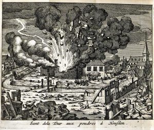 douces. Amsterdam, Henry & la veusve de Théodore Boom, 1682. In-12° : [8 dont titre gravé]-446-[15] pp.; 5 h.-t. Rel. de l'époque : plein veau moucheté, dos fleuronné doré à nerfs, tr. jaspées de rouge (très pet. manques de cuir au dos et à la coiffe sup., 3 coins et 1 coupe fort émoussés). Édition originale de la traduction d'un numéro de l'"Hollantsche Mercurius", périodique annuel, par le médecin et historien Louvet (1617-1680 ?). Illustré d'un titre gravé représentant de manière stylisée les événements de l'année 1680, de deux portraits (le dauphin Louis de France et la dauphine Marie-Anne de Bavière), et de 3 planches dépliantes ("Saut de la tour aux poudres à Heusden", "Supplice du vicomte de Stafford", "Bales [sic] de feu descouvertes aux environs de Lubec"). Parmi les événements relatés dans ce volume, citons : "Angleterre inquiétée par le papisme", "Différent entre le Danemarc [sic] et les Estats Généraux des Provinces-Unies touchant le navire le Concordia", "Différent touchant la monnoye en Allemagne", "Tanger assiégé", "La France s'attribue la souveraineté de la Basse-Alsace", etc. # pas dans Barbier, Brunet, Graesse.