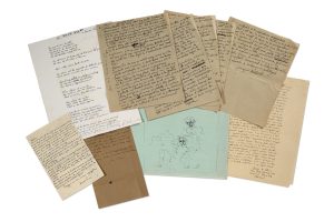 - Meret Oppenheim : 36 lettres autographes signées, 2 fragments autographes, 1 lettre autographe, 13 cartes postales autographes signées et 2 non signées et 2 enveloppes, Carona, Bâle, Bern, 1939-1969, 116 pages sur 70 feuillets in-4 et in-12 comportant des croquis et des collages originaux ;