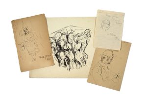 JACOB MAX (1876-1944) — Cinq dessins originaux dont deux signés. — 1926-1928 et s.d., certains au dos de manuscrits autographes, crayon et encre sur papier, formats divers.