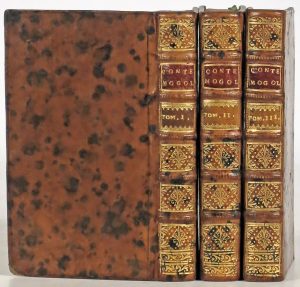 titres). Rel. de l'époque : plein veau marbré, dos fleuronnés dorés à nerfs, roul. fleuronnée dorée sur les coupes et remplis, tranches rouges (un coin lég. émoussé, lég. craquelure dans la marbrure, t. Ii lég. insolé). Édition originale. À coté de son abondante production de pièces de théâtre, Gueulette (1683-1766) s'était fait une spécialisation de contes orientaux amusants, surfant sur le succès des Mille et nuits récemment "traduites" par Galland et trouvant son inspiration dans les récits de voyages, des recueils de facéties, la bibliothèque orientaliste de d'Herbelot et sa propre imagination. Complet de la liste des ouvrages de Gueullette et de l'errata in fine du tome III.